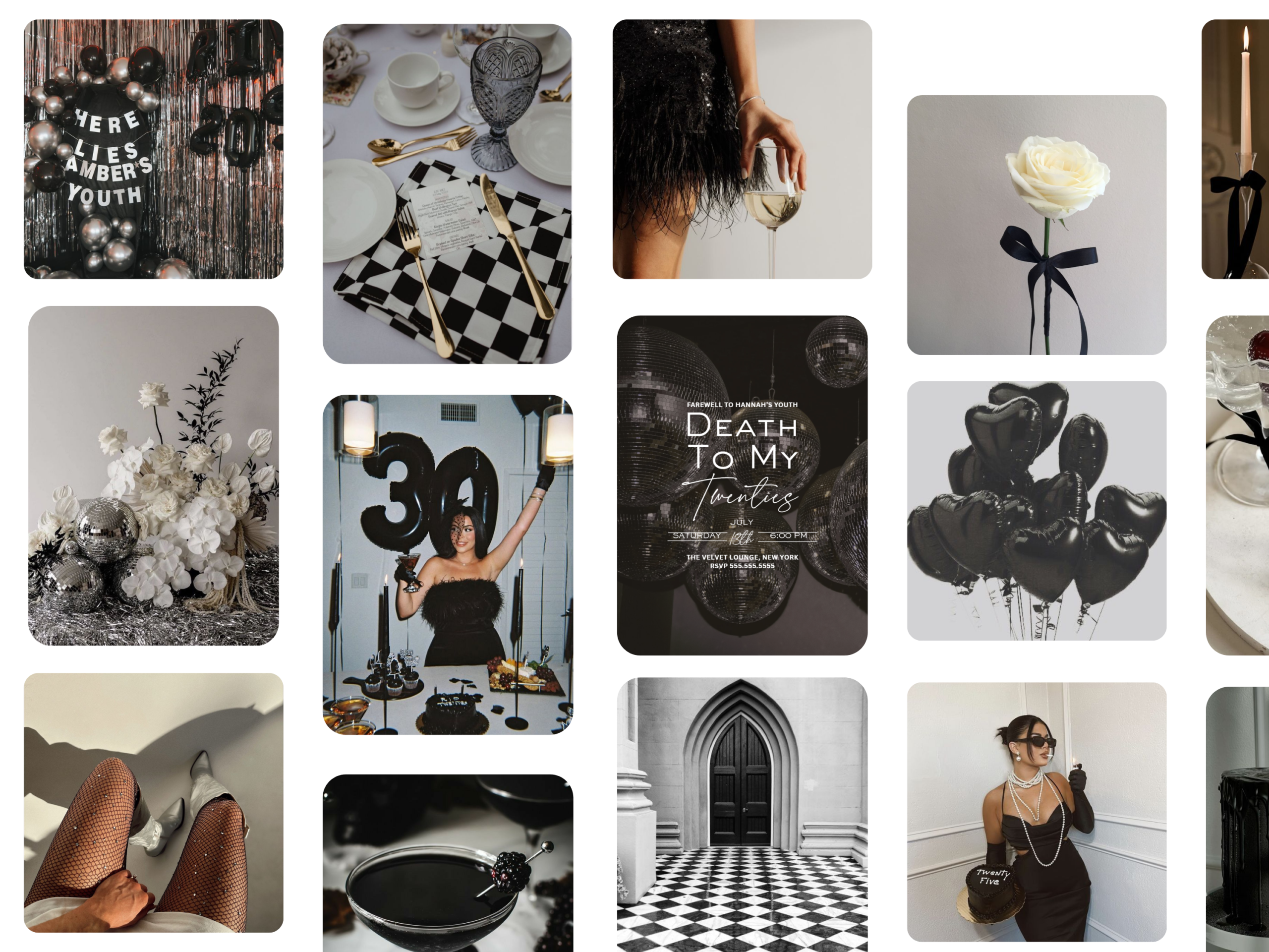 The Death to My 20s theme blends dark elegance with a cheeky edge. Black-and-white palettes, disco balls, and moody lighting set the scene for a celebration that feels both dramatic and unforgettable—whether you’re hosting a dinner party, cocktail night, or all-out bash.
