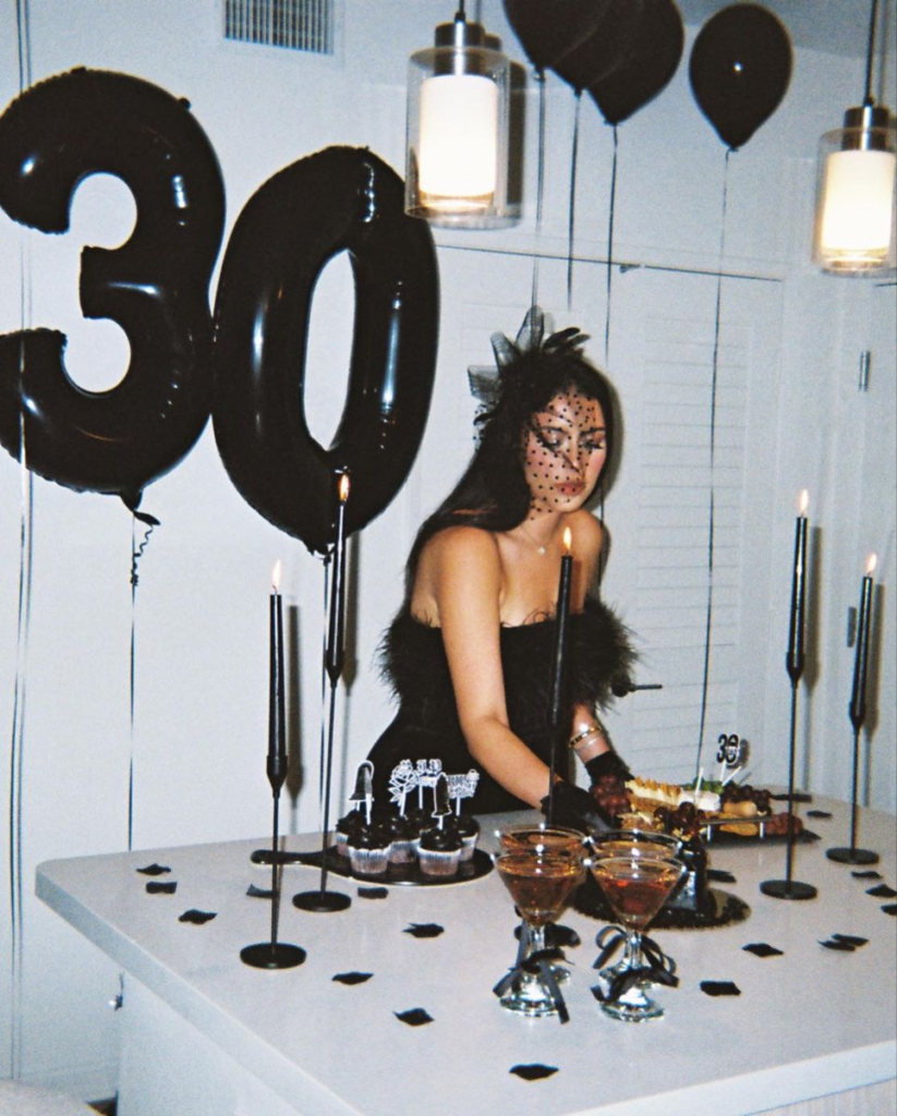For a Death to My 20s celebration, I love mixing moody glam with playful touches. Start with a dramatic black base—think velvet ribbons, heart balloons, and candlesticks—then layer in shine with disco balls, metallic accents, and hints of white florals. Balance the look with textures like satin, leather, and sequins for a vibe that’s sultry yet still celebratory.