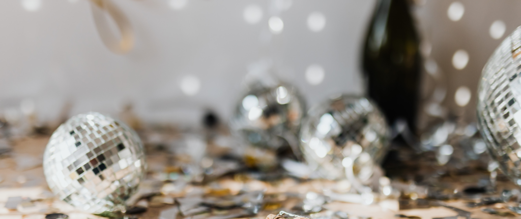 Layer warm gold tones with reflective textures — sequins, foil, tinsel, and champagne accents — to build a sophisticated but party-ready atmosphere. Add a chic neon sign or sparkling bar moment to anchor the room and give guests the perfect photo spot. The overall vibe? Confident, radiant, and undeniably flawless.