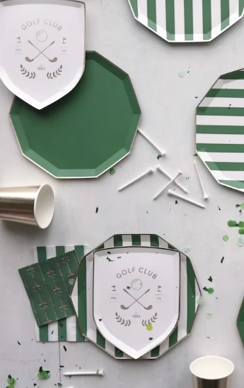 Create a country-club-meets-celebration moment with classic greens, preppy plaids, and vintage golf details. A grass wall backdrop sets the scene, while golf-themed plates, striped napkins, and custom matchboxes add charming clubhouse touches. Finish with soft, muted balloons and custom drink parasols for a playful nod to the course — polished, nostalgic, and perfectly Par-Tee ready.