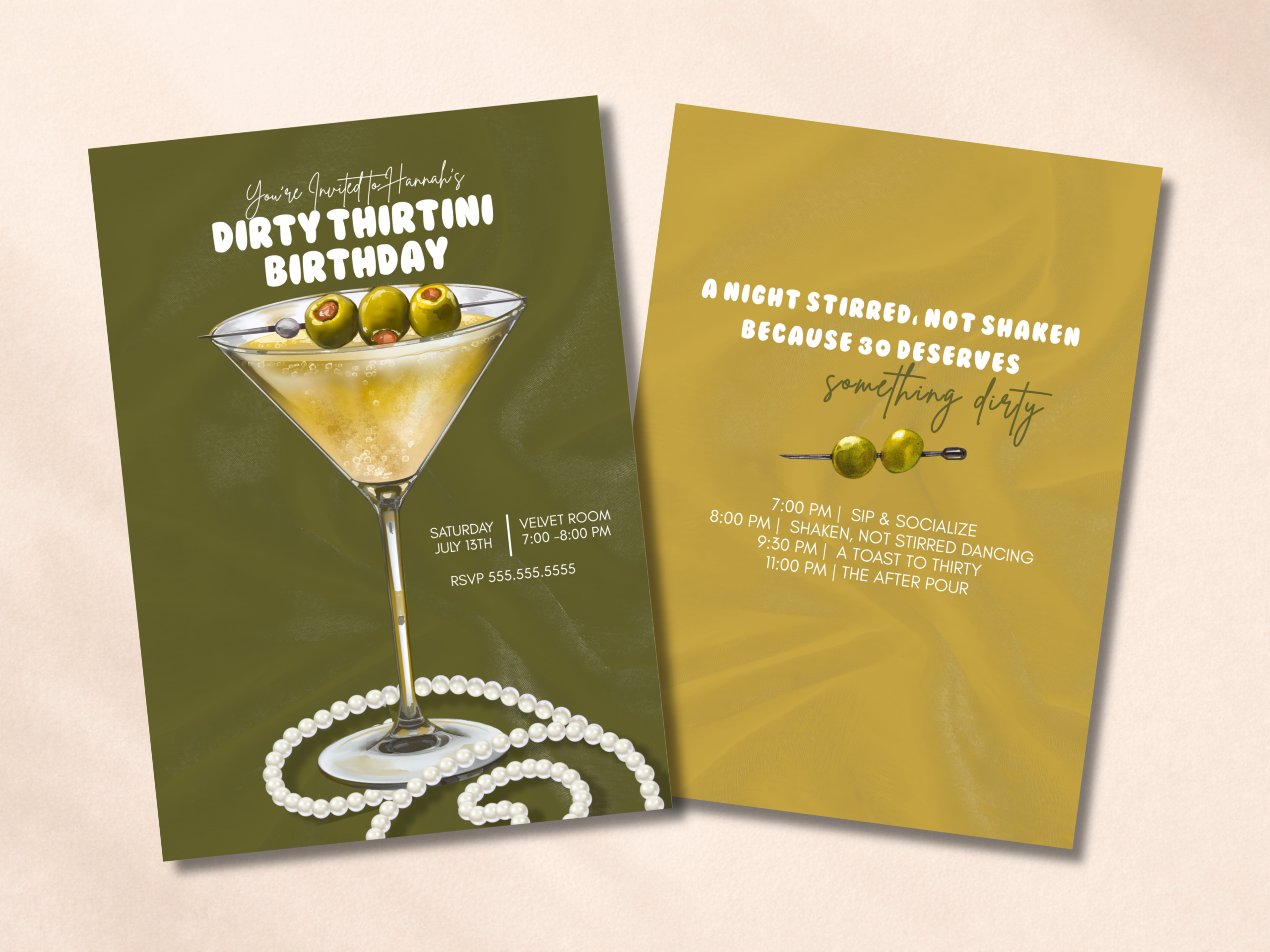 Dirty Thirtini 30th Birthday Invitation & Itinerary Template | Editable Canva Invite | Classy Martini Theme Birthday Party |Digital Download