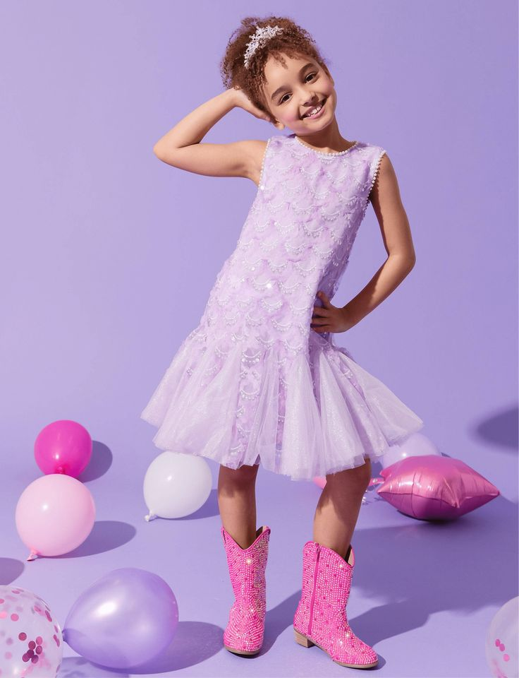 Dive into enchantment with this stunning mermaid-inspired tutu dress, featuring shimmering scale-like sequins that catch the light beautifully. Designed with a layered, flared tulle skirt that adds volume and elegance, perfect for twirling. The soft lavender hue and intricate details make this dress ideal for special occasions and magical playtime.