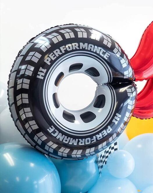 6 PCS Race Car Tire Foil Balloons, 30 Inch Reusable Racing Wheel Balloons with Ribbon, Glue Dots and Straw