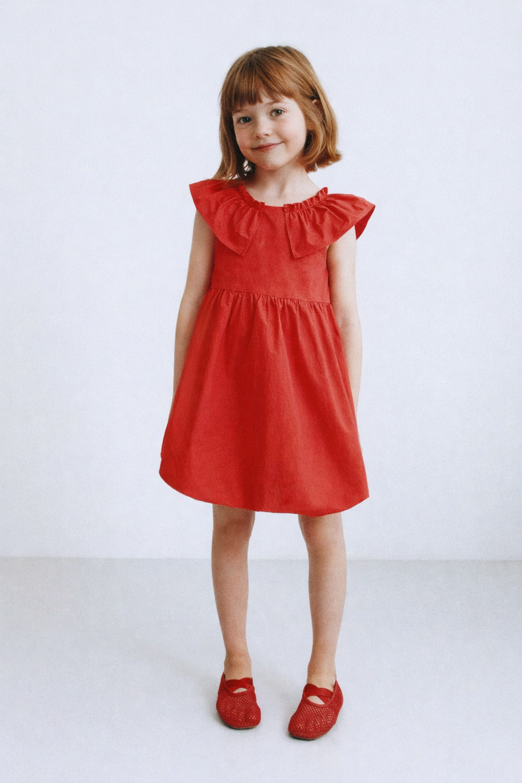 Dress with round neck and sleeveless design with ruffle appliqué. Teardrop button closure at back. Balloon skirt detail.