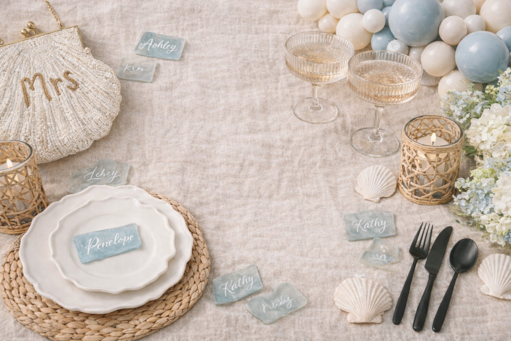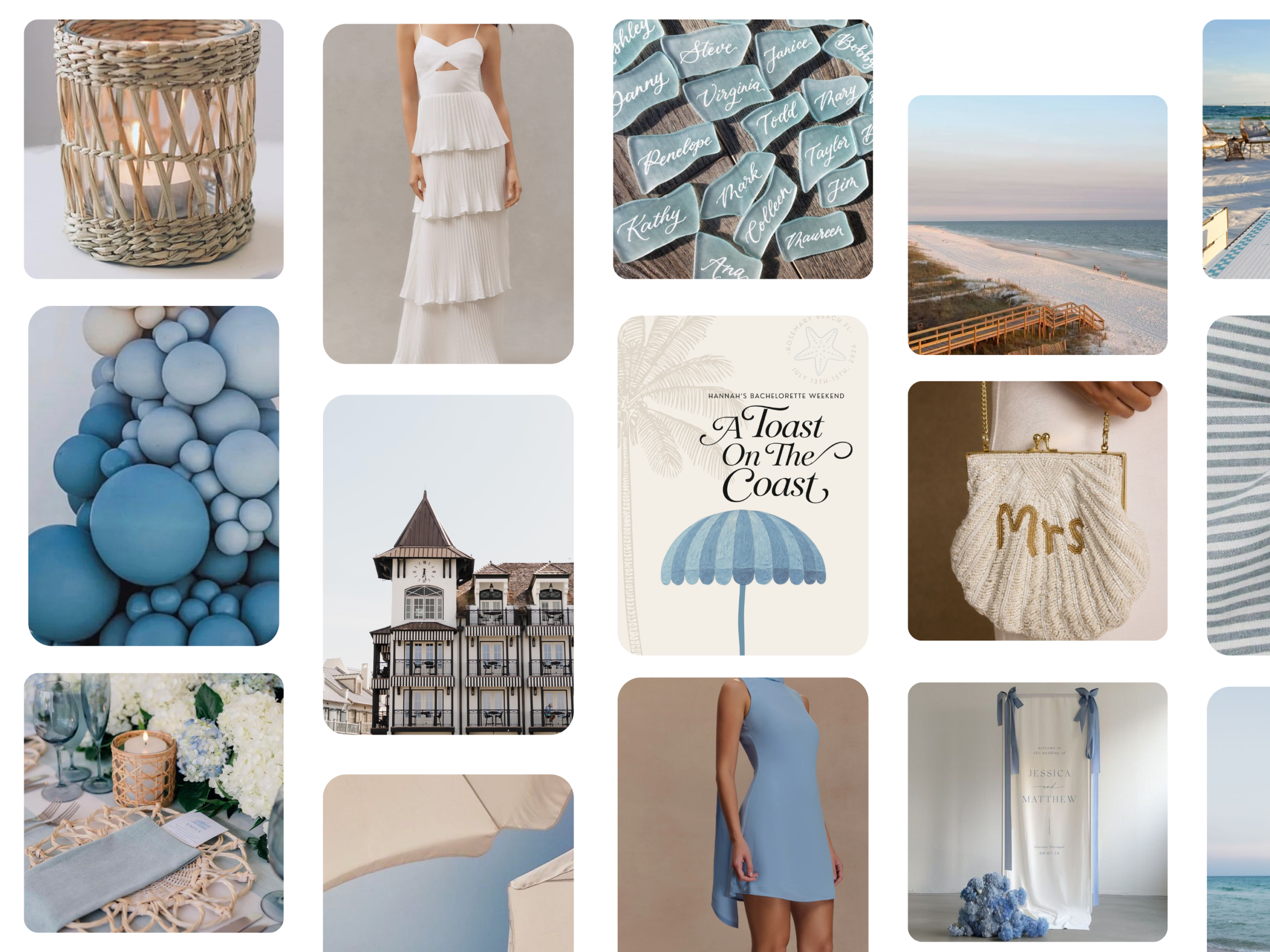 Soft ocean blues, woven textures, and champagne at golden hour — A Toast on the Coast is the perfect blend of relaxed luxury and seaside celebration. Inspired by Rosemary Beach charm and breezy Gulf Coast afternoons, this theme is refined, fresh, and beautifully understated.