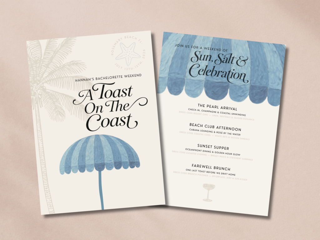 Start your weekend with an invitation that sets the tone — elegant, coastal, and effortlessly chic. The A Toast on the Coast template is the perfect first step for a seaside bachelorette or beach-inspired celebration.